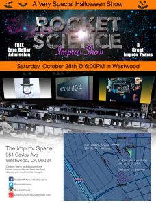 We’re excited to present a very special (and creepy) FREE Halloween Rocket Science Improv Show. First off, feel free to wear Halloween costumes. Some of the players and audience members have already said they intend to do just that. Secondly, we’ve asked all three teams to get scene suggestions from the audience based on what frightens them. Three great teams: GEO Speedwagon, Link In Bio., and Room 604 will all be at Rocket Science, and we hope you’ll be there too. Bring your own food, libations, and nightmares. It’s on Saturday, October 28th at 6PM at The Improv Space in Westwood.