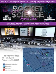 Spring is here! (Well, almost.) Thankfully, the Rocket Science Improv Show will help get you over those last days of winter. On Saturday, March 10th at 6PM at The Improv Space in Westwood we present a free improv show featuring some amazing improv teams. Three great improv teams will light up the stage with performances based on your suggestions.