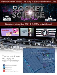 Here’s the way we see it: by next week Saturday you are going to be all familied out. You’re going to be tired of eating Thanksgiving leftovers and you are going to want to get OUT. Thankfully, the Rocket Science Improv Show has you covered. On Saturday, November 25th at 6PM at The Improv Space in Westwood we present a free improv show featuring some of your favorite improv teams. Three amazing improv teams will light up the stage with performances based on your suggestions.