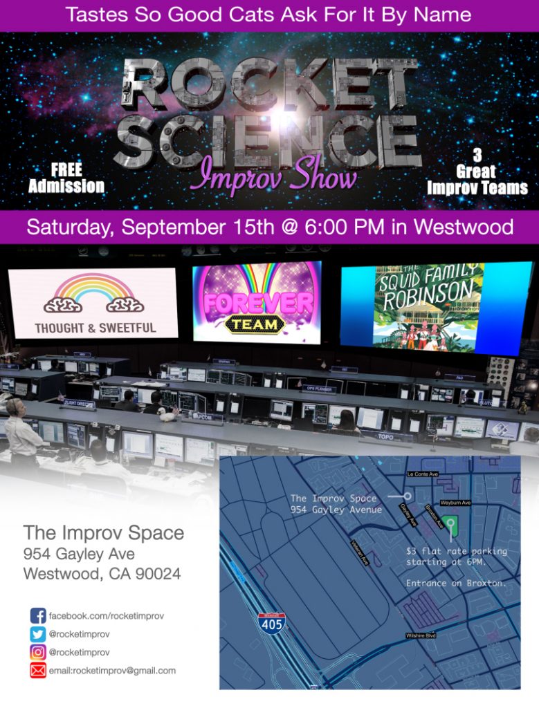 The weekly, free, Rocket Science Improv Show is this Saturday, September 15th at 6PM at The Improv Space in Westwood. Co-hosts Forever Team and Squid Family Robinson are pleased to present Thought and Sweetful. This show is going to be all rainbows and unicorns… and squids!