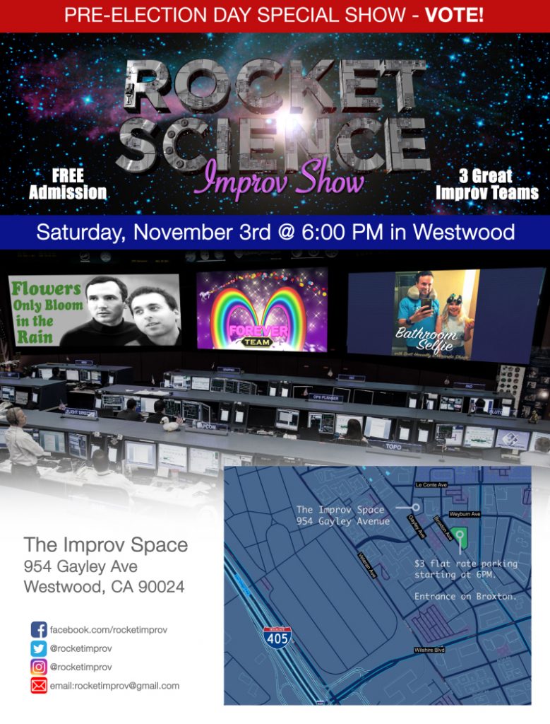 The next Rocket Science Improv Show exists for one important reason. We want you to get out and VOTE the following Tuesday. It also exists for another important reason: to entertain the heck out of you. Also, this show is to present some great teams and players we really love. Okay, so make that THREE very important reasons.