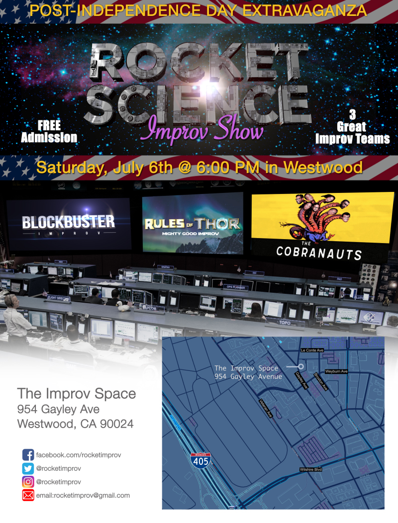 The Rocket Science Improv Show is back and here to help you continue to celebrate the Fourth of July weekend. On Saturday, July 6th, 6PM at The Improv Space in Westwood, we invite you to come out for some fireworks*. We’re extremely excited by these teams, two of which are brand new to the Rocket Science stage.