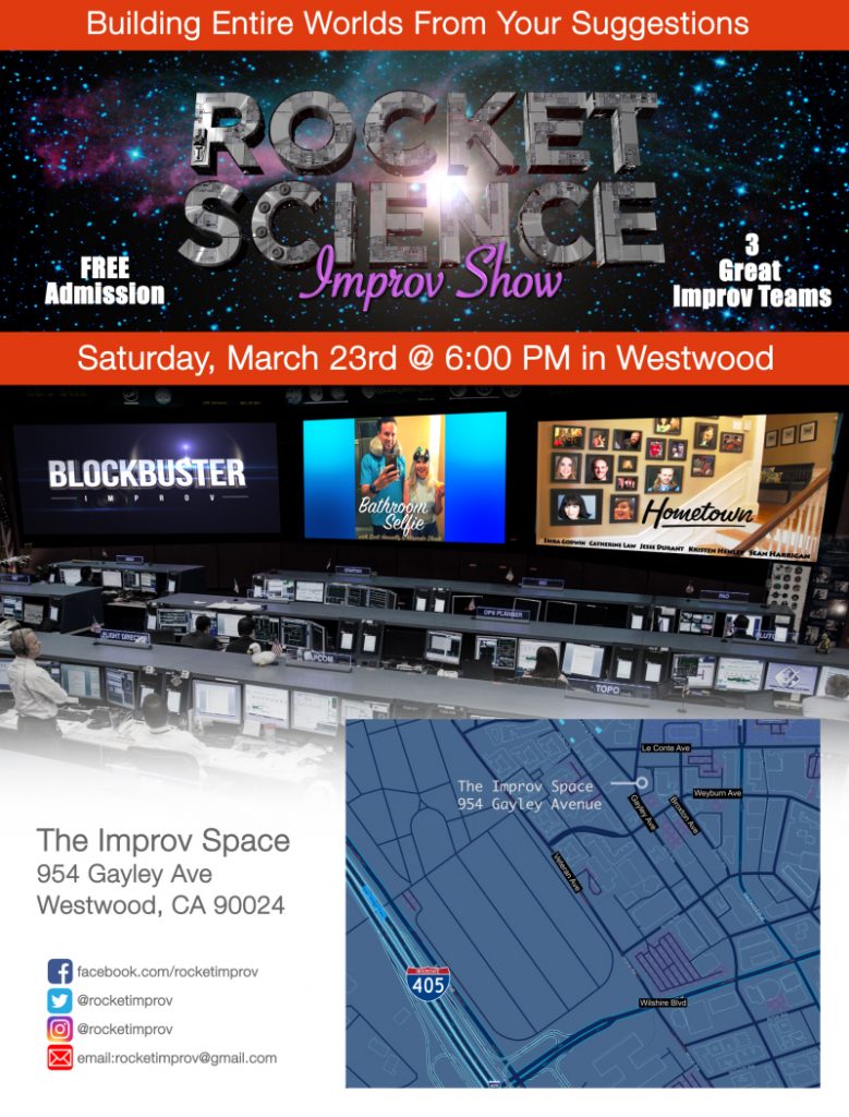 The Rocket Science Improv Show is back again on Saturday, March 23rd, 6PM at The Improv Space in Westwood. We’ve got an amazing, FREE, improv show featuring three fantastic teams. We scoured the planet (or at least the Los Angeles region) to bring you a show that is guaranteed to wow you. Check out this line-up: