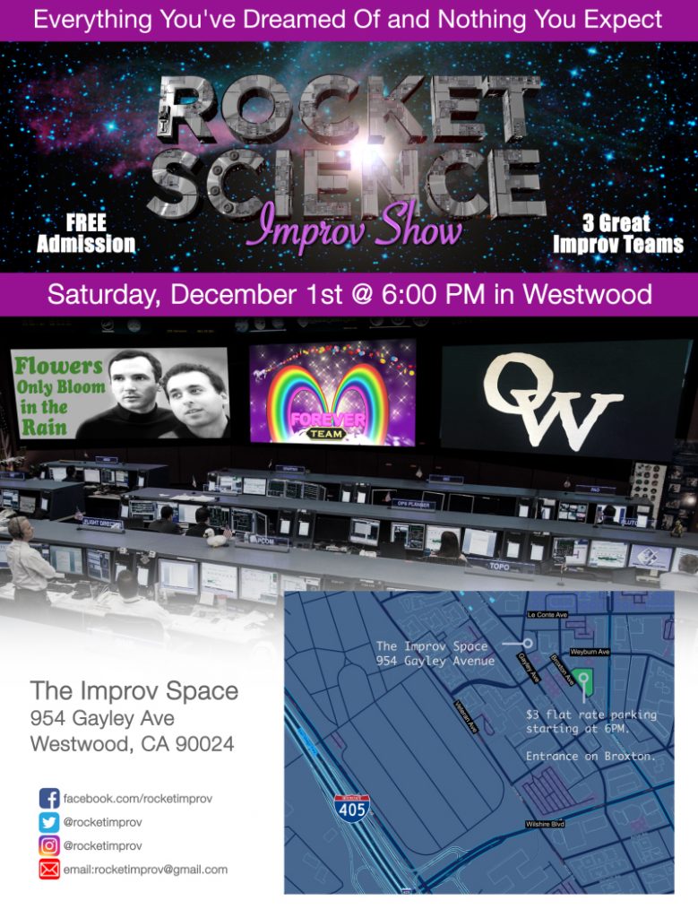 On Saturday, December 1st, 6PM at The Improv Space in Westwood, we’ve got an amazing, FREE, improv show featuring three great improv teams. This week’s show brings teams from across the southland with the sole purpose of getting your Saturday night started off right. Check it out: