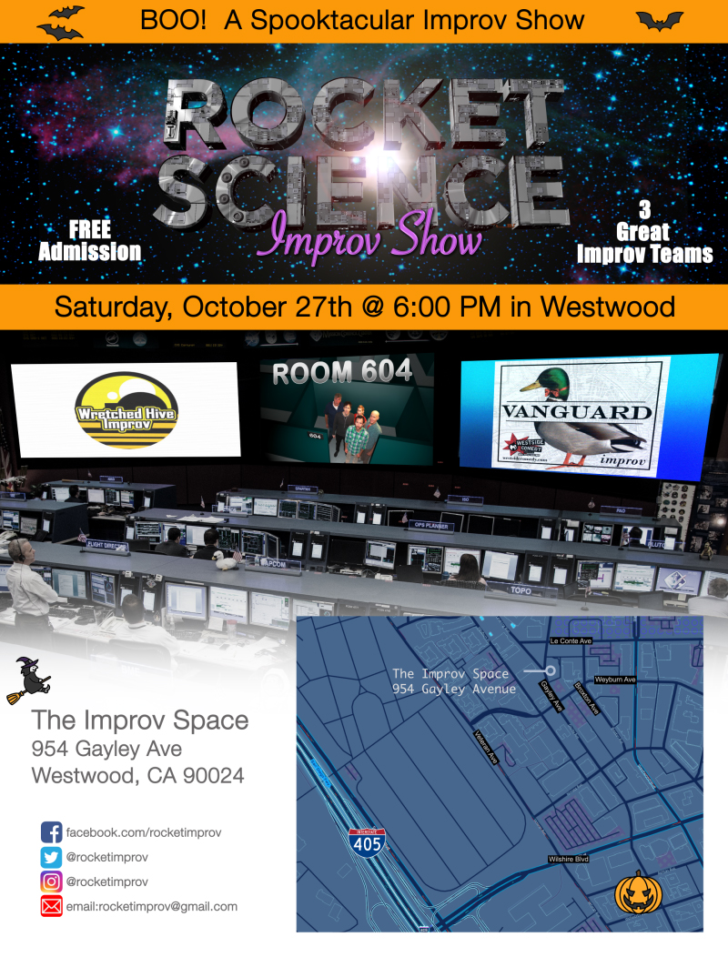 Happy Halloween from the Rocket Science Improv Show! We definitely have a Halloween TREAT for you and we’re not going to have to TRICK you into going. The next FREE Rocket Science Improv Show is on Saturday, October 28th at 6PM at The Improv Space in Westwood. You won’t be saying “BOO!” when you see this amazing Halloween line-up. We present three fantastic improv teams creating worlds of horror and suspense, based on your suggestions. Wretched Hive will return to Rocket Science to present another chapter in their expanding universe of Star Wars-inspired improv. Vanguard is back on the Rocket Science stage, and aim to present their most diabolical show yet. And Room 604 will transport you to the location where evil lives.