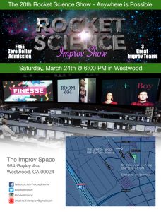 We’re excited to present the TWENTIETH Rocket Science Improv Show this Saturday, March 24th at 6PM at The Improv Space in Westwood. This free show features three great improv teams will light up the stage with performances based on your suggestions.