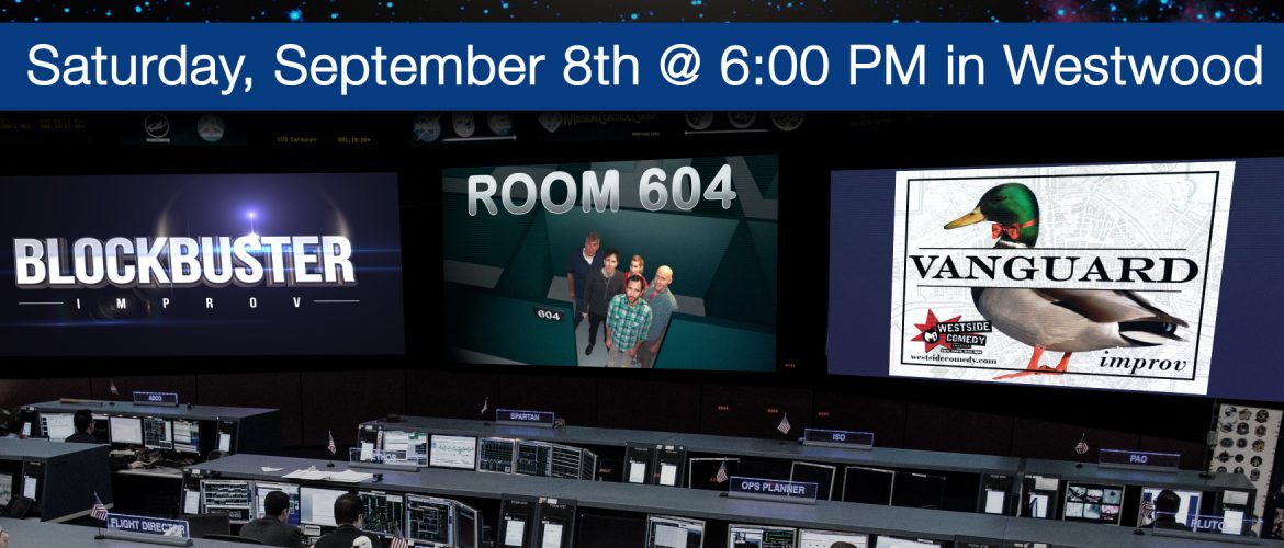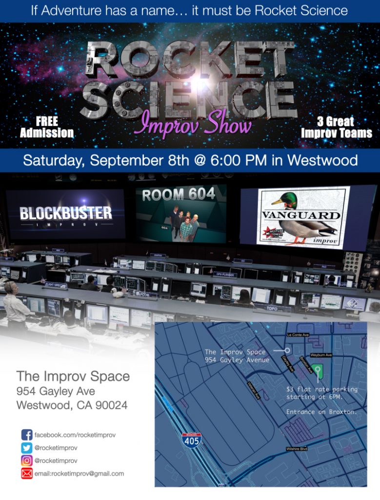 The Rocket Science Improv Show is back again on Saturday, September 8th, 6PM at The Improv Space in Westwood. We’ve got an amazing, FREE, improv show featuring three amazing improv teams. This week’s show features a bit of the old and a bit of the new. Room 604 is co-hosting with their stalwart pals from Vanguard. Plus we are pleased to present the world premiere of Blockbuster.