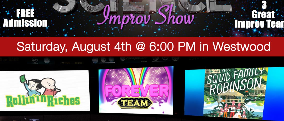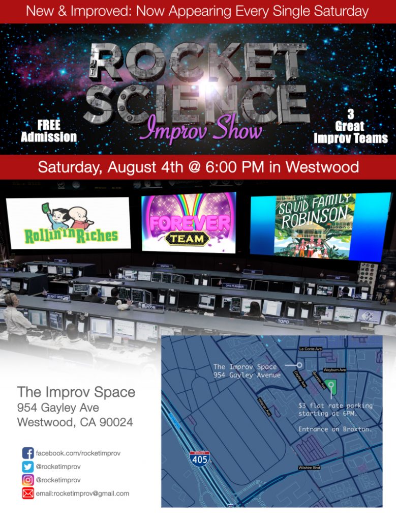 The Rocket Science Improv Show is now a weekly event! Starting this Saturday, August 4th at 6PM at The Improv Space in Westwood we are going weekly. Every Saturday we present a free improv show featuring three amazing improv teams with performances based on your suggestions. Room 604 will alternate the hosting duties with Forever Team.