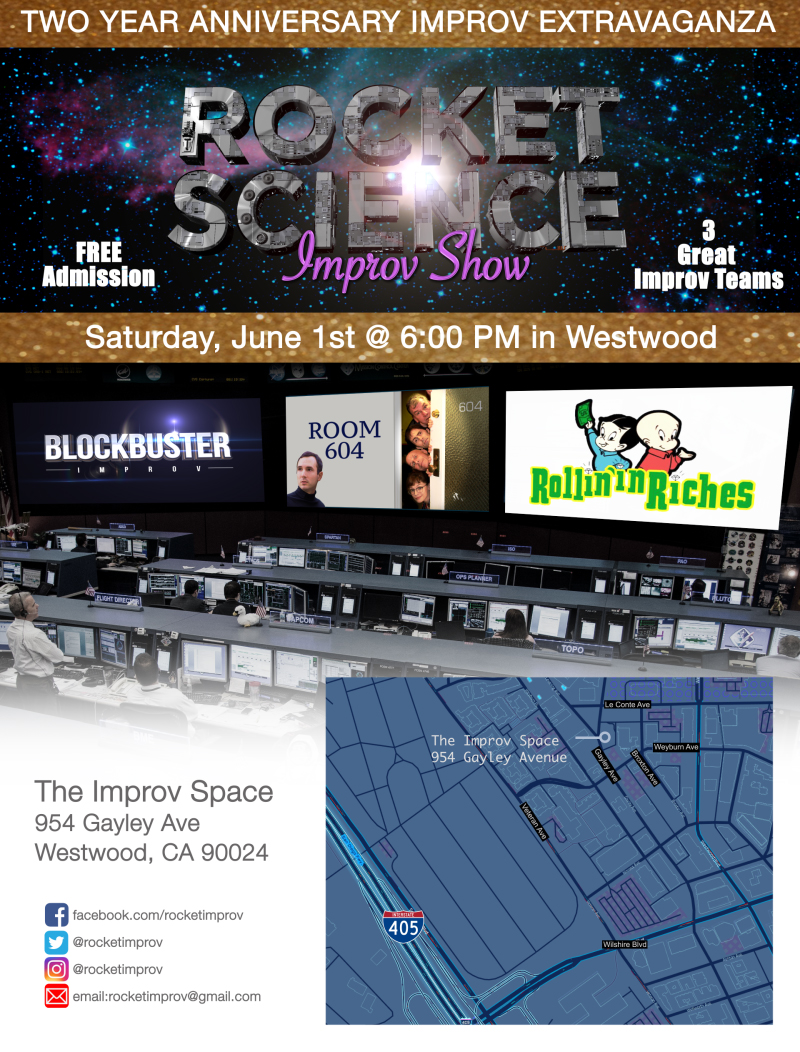The Rocket Science Improv Show is now two years old! To celebrate, we have put together our greatest show yet. Saturday, June 1st, 6PM at The Improv Space in Westwood, we invite you to come and celebrate with us. Get ready to uncork the champaign and sprinkle the confetti*. This FREE, improv show features three fantastic improv teams. Check out this line-up: